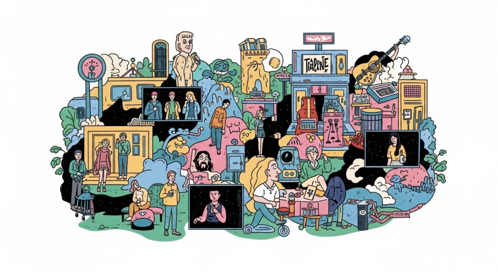 Film und Fernsehen sind zentrale Medien der Populärkultur, die Kunst in vielfältiger Weise integrieren. Künstlerische Elemente wie visuelle Ästhetik, Musik, Kostümdesign und narrative Strukturen prägen die Produktion von Filmen und Serien. Beispielsweise nutzen Regisseure wie Wes Anderson oder Quentin Tarantino künstlerische Techniken, um unverwechselbare visuelle Stile zu schaffen, die sowohl populär als auch künstlerisch anerkannt sind. Anderson verwendet symmetrische Kompositionen und eine ausgeprägte Farbpalette, die an Gemälde erinnern, während Tarantino Elemente des postmodernen Theaters und der Popkultur in seinen Filmen kombiniert.