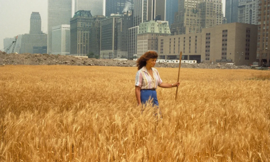 Ein weiteres berühmtes Beispiel ist Agnes Denes‘ „Wheatfield – A Confrontation“ (1982): ein zwei Hektar großer Weizenacker im Herzen von Manhattan, der Themen wie Ernährung, Urbanisierung und Umweltzerstörung aufgreift.
