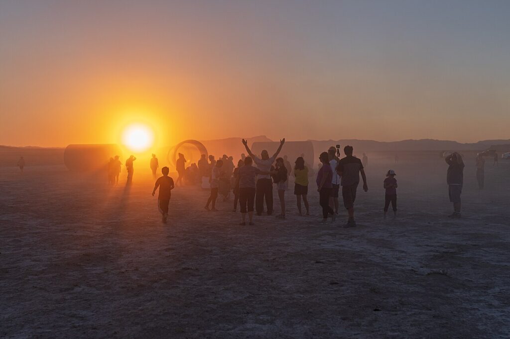 Nancy Holts „Sun Tunnels“ (1976) sind vier überdimensionale Betontunnel, strategisch so aufgestellt, dass zu den Sonnenwenden Lichtstrahlen exakt durch die kreisrunden Öffnungen dringen – eine poetische Verbindung von Astronomie, Landschaft und Kunst.
